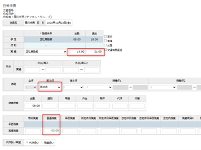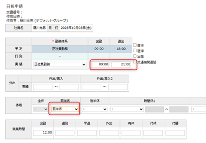 従業員が日報を申請する画面で、赤枠に出退勤時刻を入力し、休暇欄で「前半休」を選択します。
