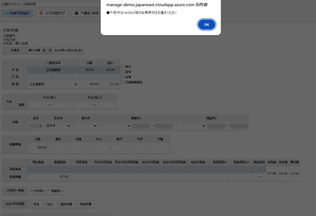 出勤時刻を自動登録されたままで日報を登録しようとすると、午前休の開始時刻を記載するようにアラートが表示され、日報申請が出せないようにしました。