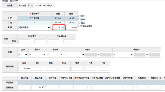 始業時刻が8:40のところ、実際の勤務開始が9:00なため、出勤時刻を9:00に修正します。