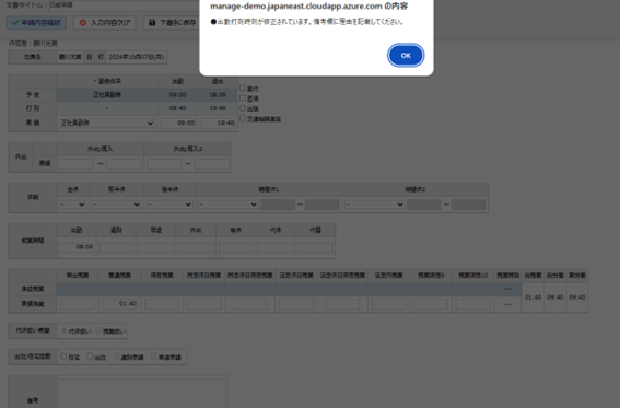 出退勤時刻を修正し、残業が発生する退勤時刻を入力した上で「申請内容確認」ボタンを押すと、入力間違いはないのでアラートは表示されず、次の画面に進みます。