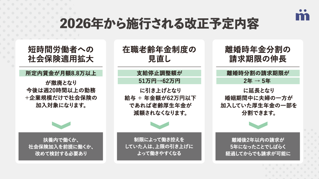 2026年の改正予定では、①短時間労働者への社会保険適用拡大(賃金要件)※②在職老齢年金制度の見直し➂離婚時年金分割の請求期限の伸長があります。