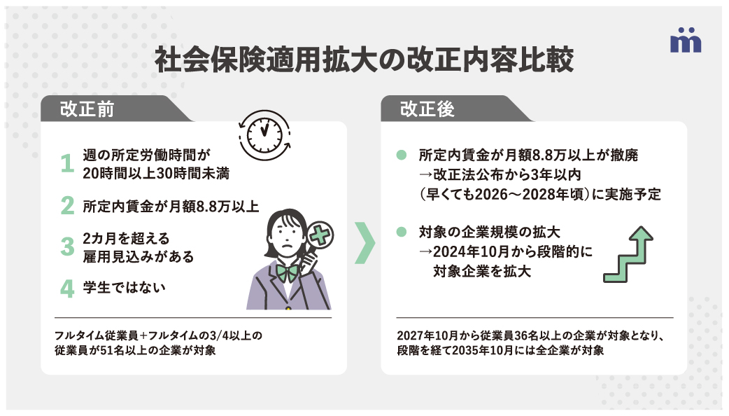 年金制度の改正により、短時間労働者への適用範囲が拡大し、これまで社会保険に加入していなかった層にも厚生年金・健康保険が適用されるようになります。