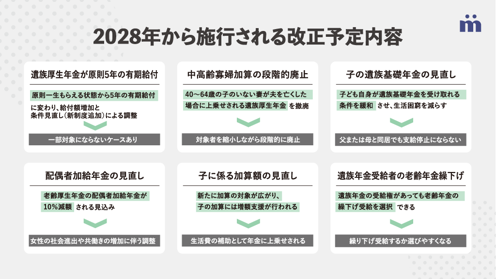 2028年4月から、亡くなった配偶者の厚生年金(標準報酬月額)を遺族側に年金分割として反映し、遺族自身の老齢厚生年金が増えることになります。