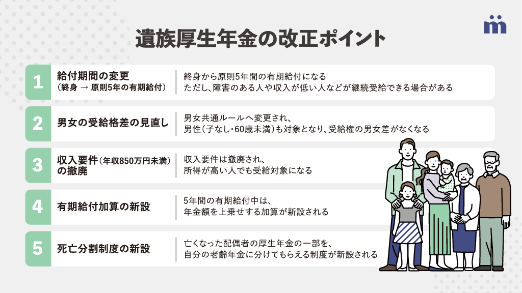 こうした社会変化を踏まえ、改正により、性別による不平等が解消され、遺族年金制度が現代の家族像や働き方により適合した形へ変更されます。
