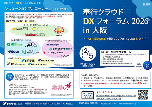 株式会社オービックビジネスコンサルタント社主催の「奉行クラウドDXフォーラム2026 in 大阪」にmanageを展示いたします。