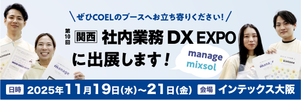 2025年11月19日(水)〜21日(金)に、インテックス大阪で行われるJapan DX Week(ジャパン DX ウィーク)内「社内業務DX EXPO」にて、manage・mixsolを出展します。